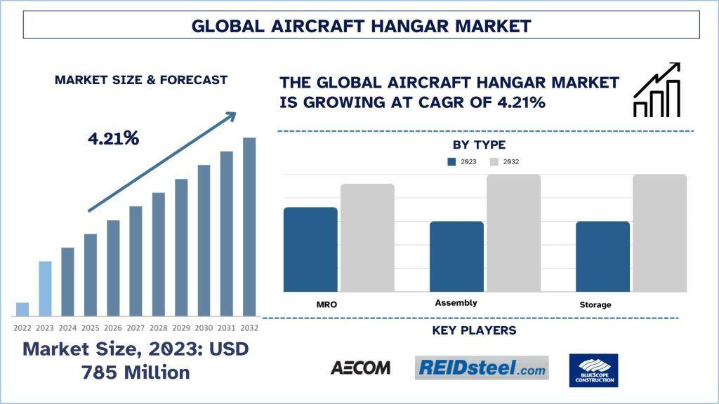 According to the UnivDatos analysis, growing demand for cockpit digitalization with Aircraft Hangars with increased efficiency will drive the growth scenario of Aircraft Hangars and as per their “Aircraft Hangar Market” report, the global market was valued at USD 785 million in 2023, growing at a CAGR of 4.21% during the forecast period from 2024 - 2032 to reach USD million by 2032.