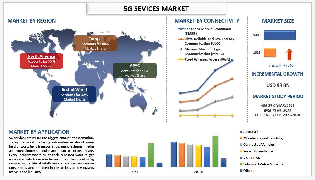 According to UnivDatos, increasing investments in 5G network infrastructure, along with rising internet usage and deeper digital penetration worldwide, are key factors accelerating the growth of the 5G Services Market. As highlighted in the 5G Services Market report, the global market was valued at USD 98 billion in 2022 and is projected to expand at a robust CAGR of 27% from 2023 to 2030, reaching a substantially higher market value by the end of the forecast period.