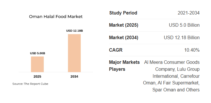 According to the Oman Halal Food Market Research Report (2026-2034) by Report Cube, the market was valued at approximately USD 5.0 Billion in 2025. Based on current industry structure and observed demand patterns, the market is projected to reach USD 12.18 Billion by 2034, expanding at a 10.40% CAGR during the forecast timeline.