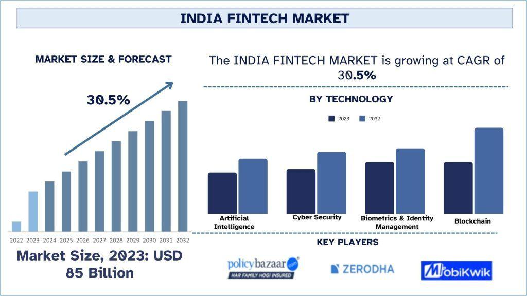 According to UnivDatos, increasing infrastructure development and strong government initiatives are expected to drive the global fintech market landscape. As per the “India Fintech Market” report, the market was valued at USD 85 billion in 2023 and is projected to grow at an impressive CAGR of 30.5% during the forecast period (2024–2032), reaching USD billion by 2032.