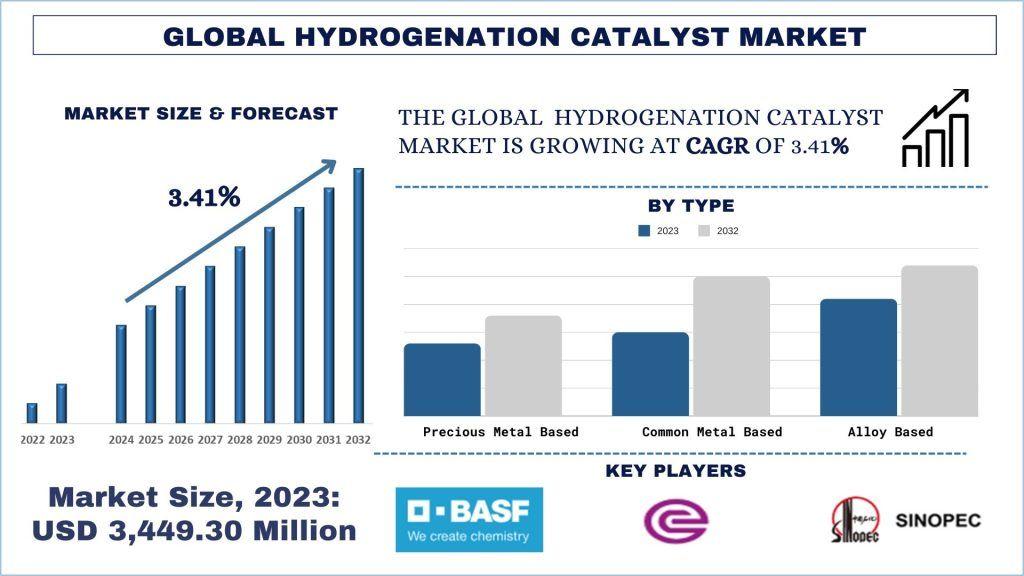 According to UnivDatos, the global hydrogenation catalyst market was valued at USD 3,449.30 million in 2023 and is projected to grow at a steady CAGR of approximately 3.41% during the forecast period (2024–2032). The market has experienced consistent growth, driven by the rising demand for cleaner fuels, sustainable chemical processes, and enhanced production efficiency across multiple industries. Manufacturers are increasingly adopting technological innovations and advanced catalyst solutions to meet evolving industrial requirements and stringent regulatory standards.