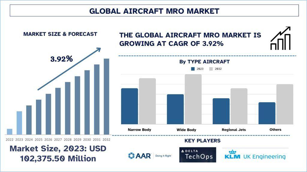 According to UnivDatos, the growing demand for efficient commercial aircraft repair and maintenance services is a key factor driving the expansion of the global Aircraft Maintenance, Repair, and Overhaul (MRO) market. As per the “Aircraft MRO Market” report, the market was valued at USD 102,375.50 million in 2023 and is projected to grow at a CAGR of 3.92% from 2024 to 2032, reaching USD million by 2032.