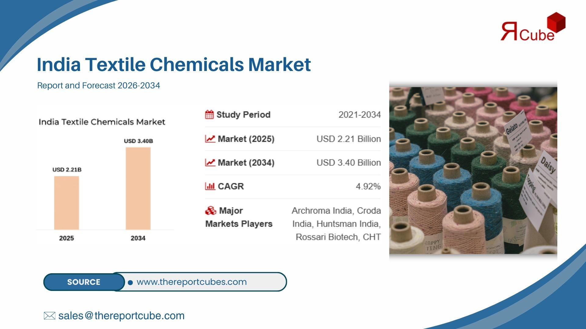 According to the India Textile Chemicals Market Research Report (2026-2034) by Report Cube, the market was valued at approximately USD 2.21 Billion in 2025. Based on current industry structure and observed demand patterns, the market is projected to reach USD 3.40 Billion by 2034, expanding at a 4.92% CAGR during the forecast timeline.