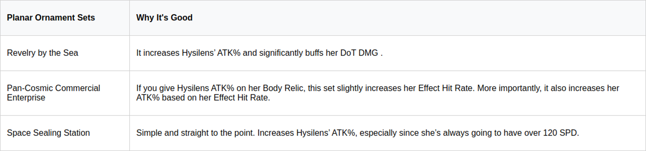 Overall, Hysilens teams thrive on rapid DOT application, frequent attacks, and smart synergy between supports and damage dealers, making her a versatile and powerful character in Honkai: Star Rail.