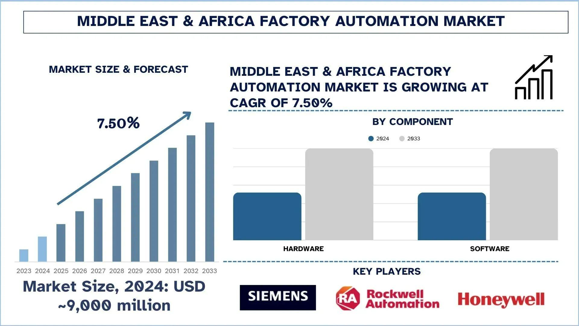 According to UnivDatos, Government-led industrial diversification & Incentives, and the Surge in EV & battery manufacturing, are key factors contributing to the market's rise. As per their “Middle East & Africa Factory Automation Market” report, the Middle East & Africa market was valued at USD 9,000 million in 2024, growing at a CAGR of about 7.50% during the forecast period from 2025 - 2033 to reach USD million by 2033.